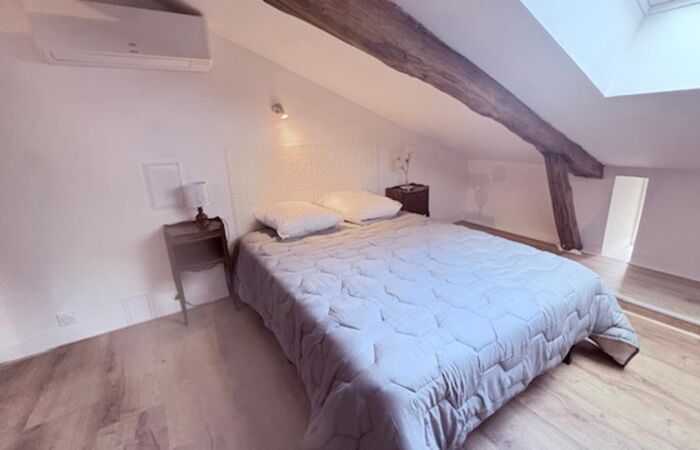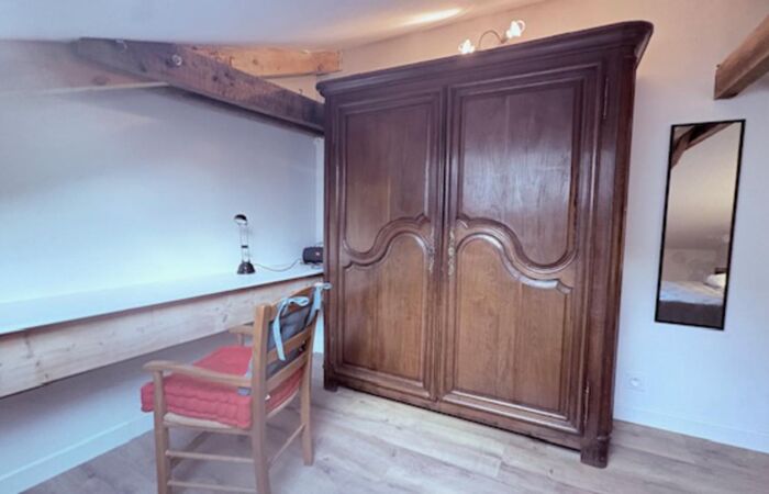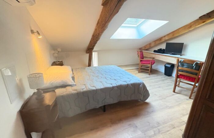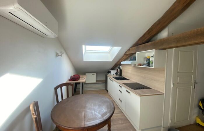 Cuisine équipé ouverte sur pièce de vie et le salon avec 1 grande chambre sous comble Armoire de rangement et espace bureau. Salle d'eau avec cabine de douche et WC.