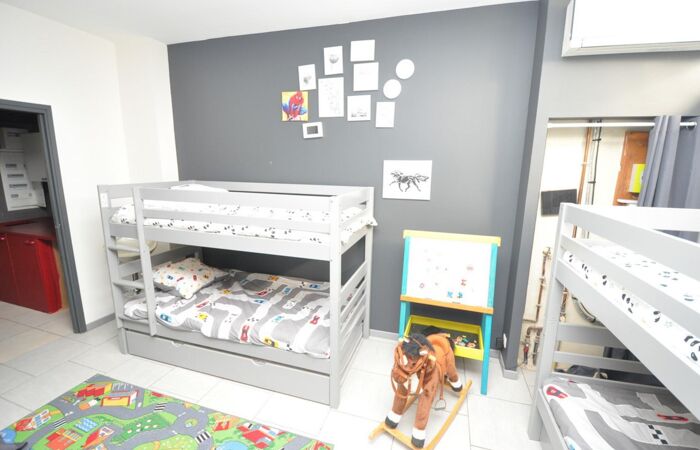 Le rez-de-chaussée accueille une chambre ou un bureau, idéal pour le télétravail ou recevoir des invités. À l'étage, l'espace nuit est composé de quatre chambres, dont une suite parentale avec sa propre salle d'eau, et d'une seconde salle d'eau pour plus de confort.